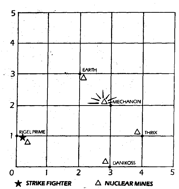 Well done. You arrive at the point on the grid which corresponds to a Timehole on Rigel Prime. The display on your faceplate shows that the mine at Mechanon has exploded and died away. The other mines are about to explode at the other Timehole points on the grid. You must engage your Variac Drive again to avoid the last mine which is racing towards you. Which coordinates will you type into your console?