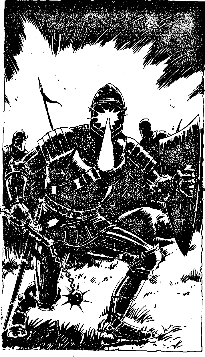 Your sword blade jars the Black Knight with a clang, and smoke and sparks fly up from its elbow joint. It staggers as if its circuits were overloading. It is certainly no man, but a droid, a mechanical man. It swivels its head towards you and the visor of Its great black helmet clicks open. You are ready when a beam of red light lances towards you from the droid's helmet and you dodge it and try to bury the tip of your sword into the gap left by the open visor. Make an Attack Roll.
