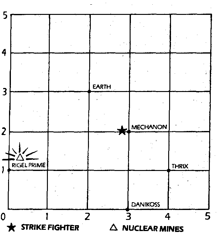 You arrive back at the point on the grid which corresponds to the timehole on Mechanon as the flare of nuclear explosion glares red on your face-up display at the other points on the grid. The blast at this point has died away but your Strike Fighter's radiation dampers are being steadily overloaded by the fallout from the atomic mine. You must leave the grid somehow, perhaps you can convince CAIN that you are not in the restricted grid of what to a computer is a 'fixed' universe. You must engage the Variac Drive once more, before the radiation reaches you. What coordinates will you type in this time?