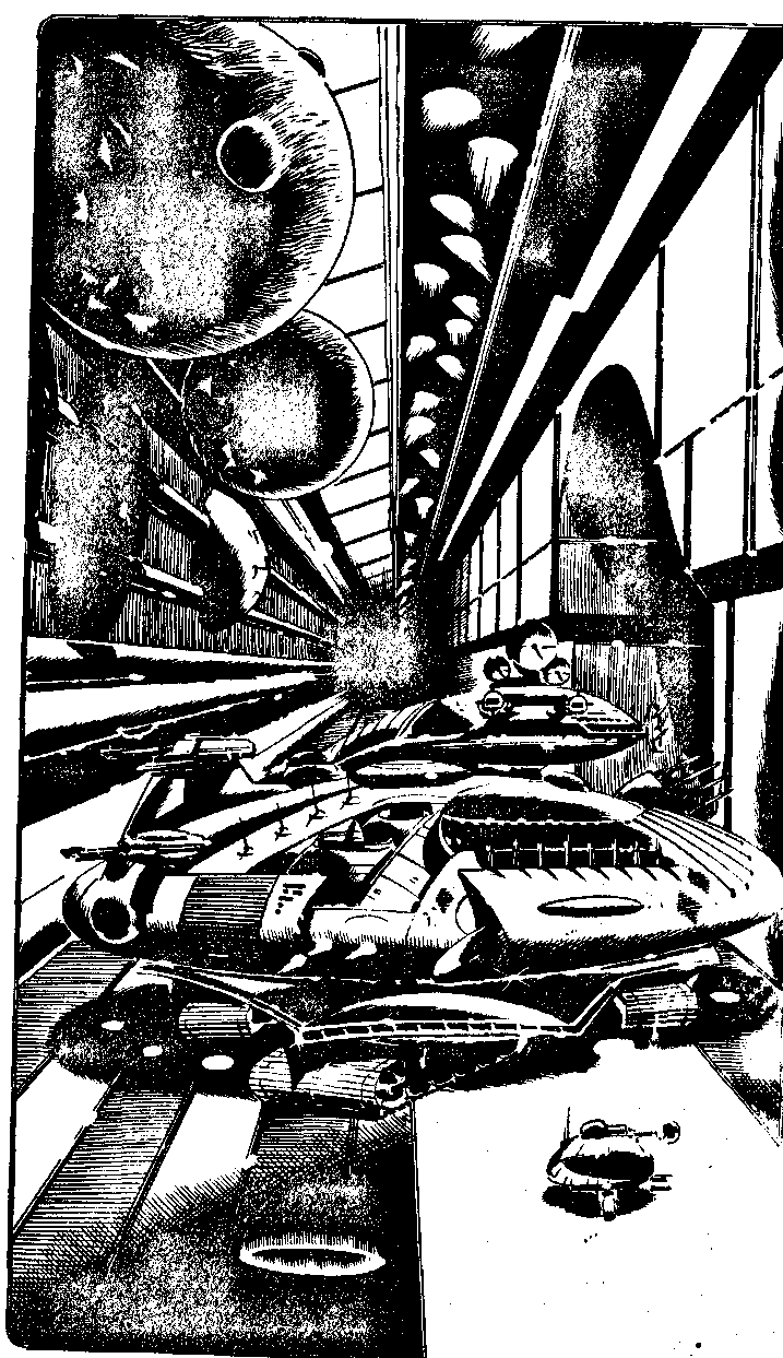 You hurtle through the air down the corridor. Below, you can see a large droid with a shield travelling on a rail running the length of the corridor. Within seconds you flash past it but moments later your microbeam radar picks up a high-energy leading ahead. A large mobile fortress lies in the corridor, an armoured disc bristling with weapon pods and sensor banks. It has two plasma cannon trained on you, several missile bases are tracking you and two energy beam gun turrets are swivelling around. The massive tunnel continues beyond it and another forks off the side. You have a few seconds in which to act. Will you: