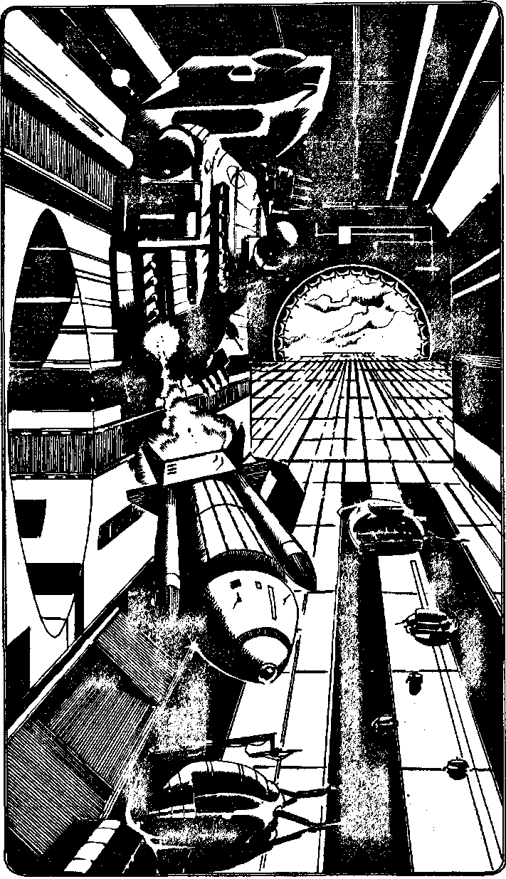 Your fusion beams blast a hole in the roof of the communications vault and you dive through and into a tunnel about which several inactive worker droids are strewn. An Atmospheric Interceptor screams after you, but you take care of it with your aft lasers. You hurtle out of the tunnel into a far larger one and, banking left, you see the droid repair shops and a missile base. The base tracks you and a missile streaks from it towards you. The rocket's drive flares brightly in the luminescent green glow of the tunnel. Will you use: